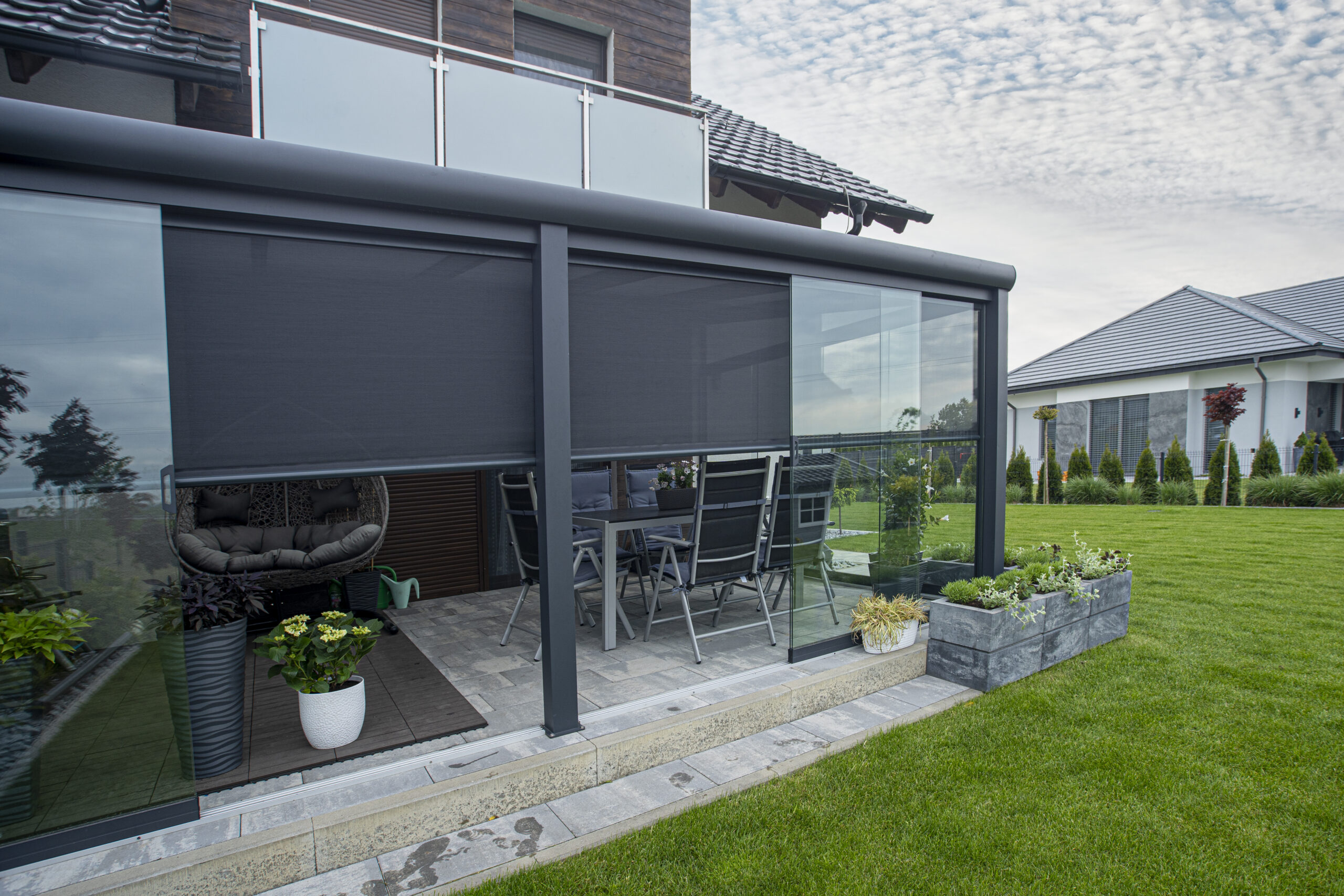 Przesłona wykonana z wysokiej jakości tkaniny, umożliwiająca spędzanie czasu komfortowych warunkach, niezależnie od pogody. Sprawdza się idealnie w upalne, słoneczne oraz wietrzne dni. Dostępne różne warianty struktury, przezierności oraz kolorystyki materiału. W zależności od wybranego wariantu przesłony są chowane w kasecie lub dostępne w formie bezkasetowej.